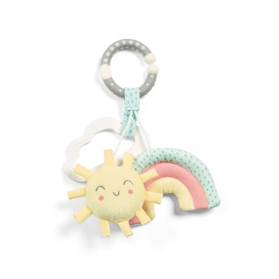 Busy little hands need soft, interesting toys to explore. Mamas and Papas Linkie Rainbow Activity Toy is sure to keep your child entertained and engaged for ages. it’s gentle to touch and perfect for tiny hands. The soft, subtle colour palette is fun and exciting, while the adorable sun character adds another playful touch. The interactive crinkle texture, means your child will enjoy scrunching and crunching the rainbow in their hands while the hidden squeaker in the sun will surprise them every time. The activity toy also comes with a handy teether, perfect for soothing sore gums. And with the handy C-ring, it’s never been easier to attach a toy to your child s pushchair, car seat or cot to keep playtime going for longer. The C-ring also doubles as an additional teether.