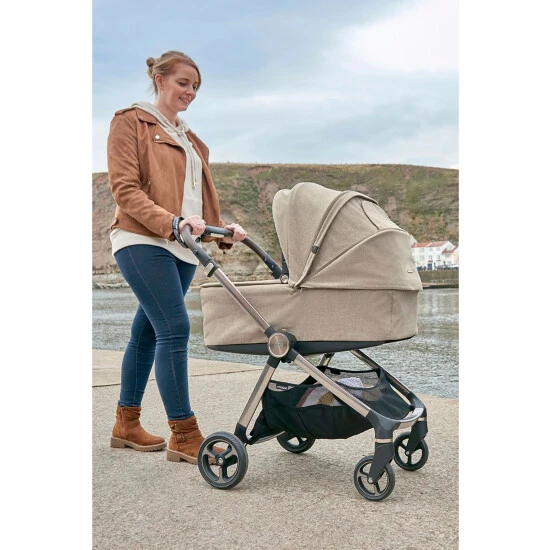 Give your newborn a comfy place to sleep whilst you’re out and about. Designed to coordinate with Mamas & Papas’ Strada Pebble pushchair, it uses your pushchair’s detachable hood to create a cosy place for your little one to nap. Finished wit with soft taupe melange fabric and dark oak leatherette trim details, this carrycot has cushioned mattress and a lie-flat position that supports a natural sleeping position – ideal for naps on-the-go. The magnetic apron means you can tuck baby away quickly and quietly, whilst the hood’s optional air vent keeps them cool and comfortable. And because you can collapse it, you can easily store it away in your home or car.